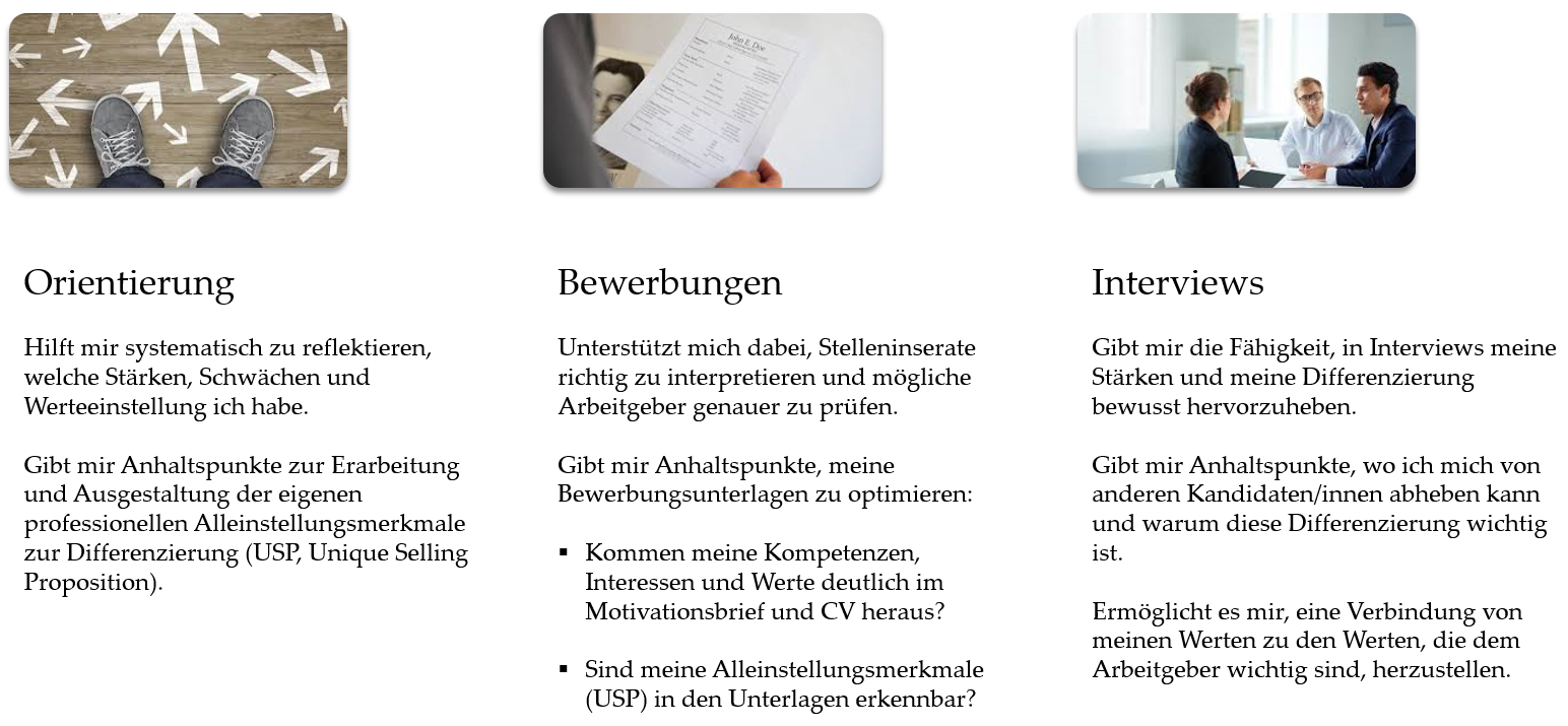 - Sie können, wenn Sie sich um eine bestimmte Stelle bewerben möchten, anhand Ihrer Interessen-, Kompetenzen- und Werte-Profile Ihren „Fit“ für die Stelle im Bewerbungsanschreiben, in Telefonaten und persönlichen Vorstellungsgesprächen unmittelbar thematisieren.